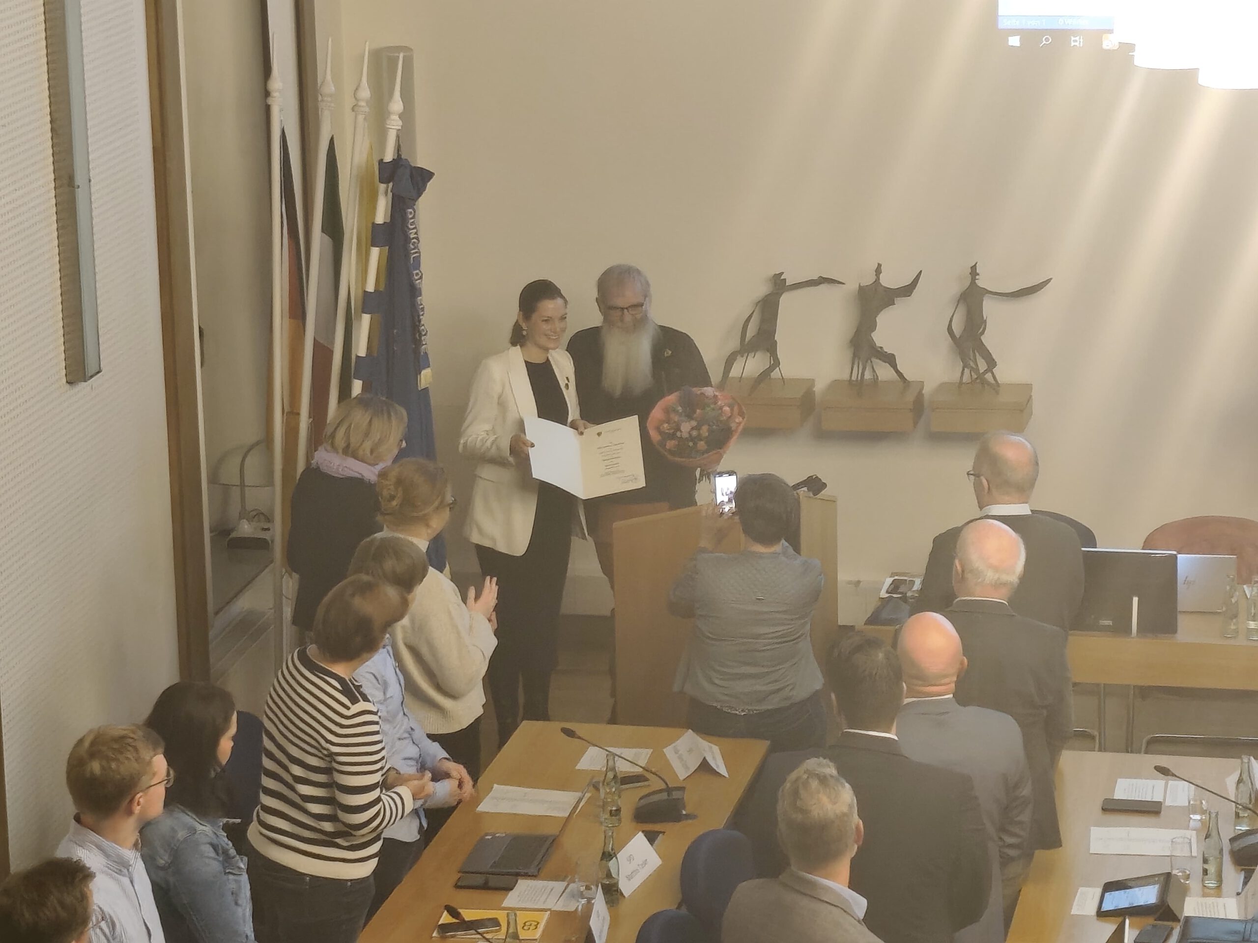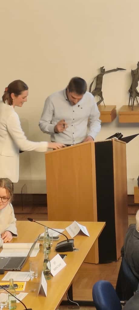 Eine ganz besondere Ehre war es für uns Ratsmitglieder, uns im Rahmen der Vereidigung in das Goldene Buch der Stadt Coesfeld eintragen zu dürfen. Als Zeichen der Wertschätzung erhielten wir zudem eine Goldene Anstecknadel der Stadt Coesfeld aus den Händen der Bürgermeisterin – ein Moment, der den offiziellen Start in die neue Wahlperiode feierlich abrundete.